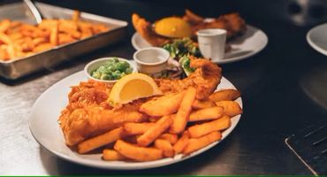 Breaded scampi served with twice cooked chunky chips, mushy or garden peas & tartar sauce
